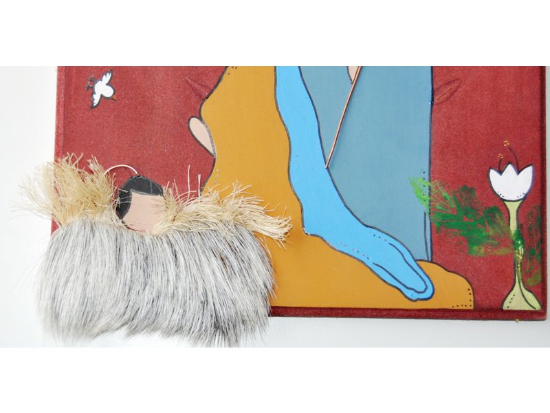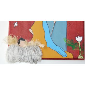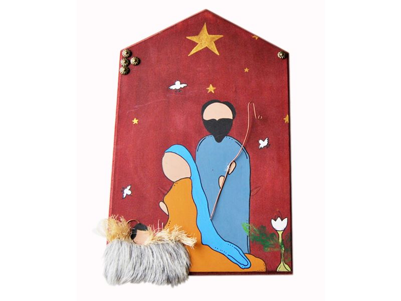Hermoso nacimiento pintado a mano en un tablón de madera. Tiene detalles de cuero de chivo, fibra de cocuiza y de metales. Simboliza el nacimiento de Jesús en Belén. Para colgar en la pared.
