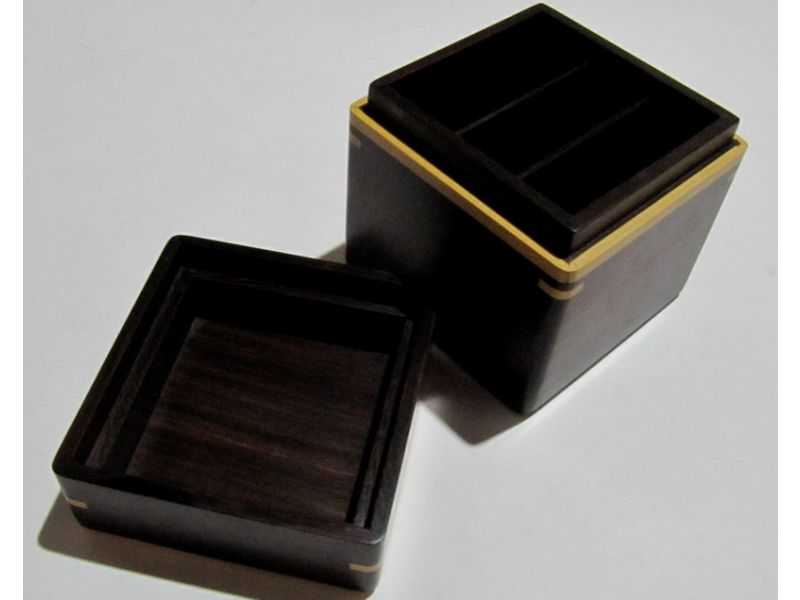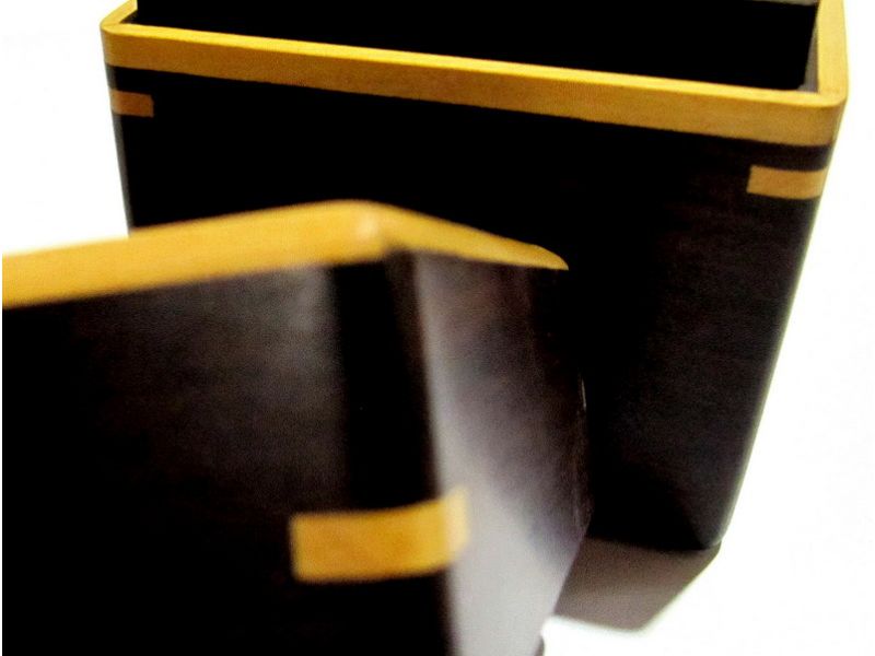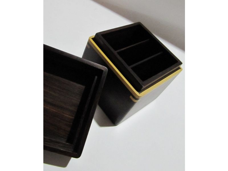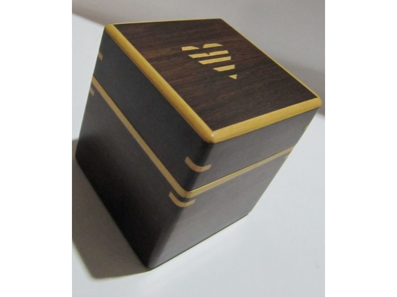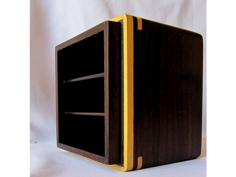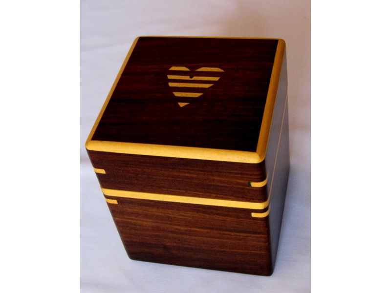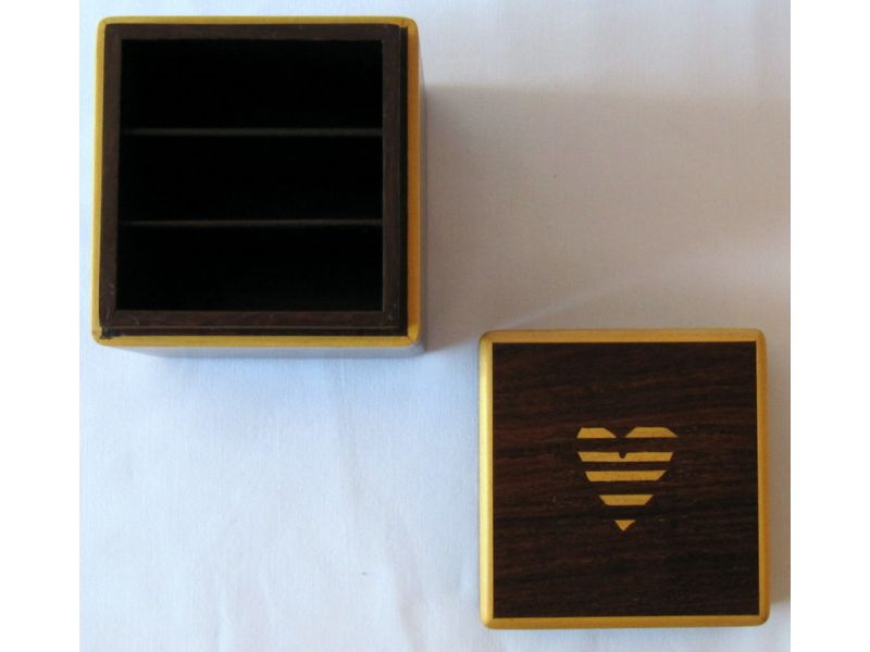 Original caja de madera pulida con incrustaciones de madera. Superficie suave al tacto. Tiene tres divisiones verticales internas. Sirve para guardar primorosamente objetos muy queridos o simplemente usarlo en la oficina como un objeto decorativo útil para guardar objetos pequeños tales como clips. Está formado por madera incrustada en tonos marrones oscuros. En la tapa tiene un corazón en madera incrustada, lo que le da un toque romántico y especial para mostrar al ser querido amor y confianza. Un regalo original y diferente. Hecho a mano por artesanos venezolanos.